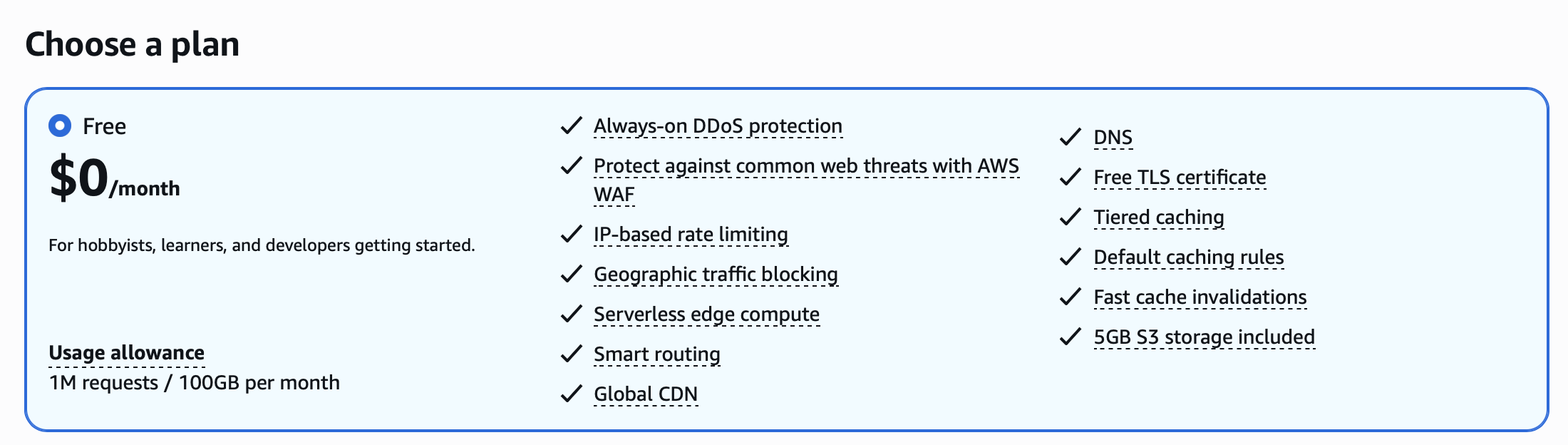 之所以想要換成AWS CloudFront ,是因為經過這些年行業廝殺,也有了0$ 的方案,主要特徵如下: